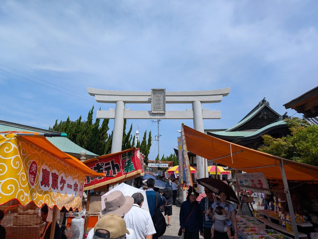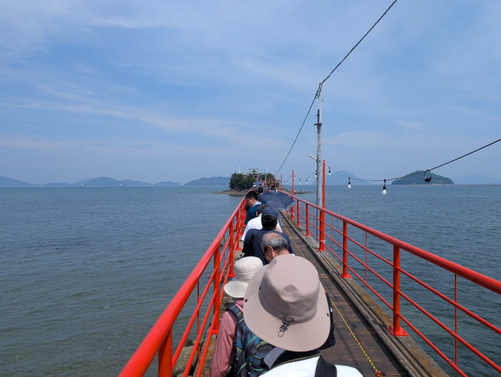津島神社は瀬戸内海の小島に社殿があり、橋がかけられている。ただし社殿に渡れるのは祭り期間中のみ。通常時は渡れないとのこと。面白そうなので行ってみる。