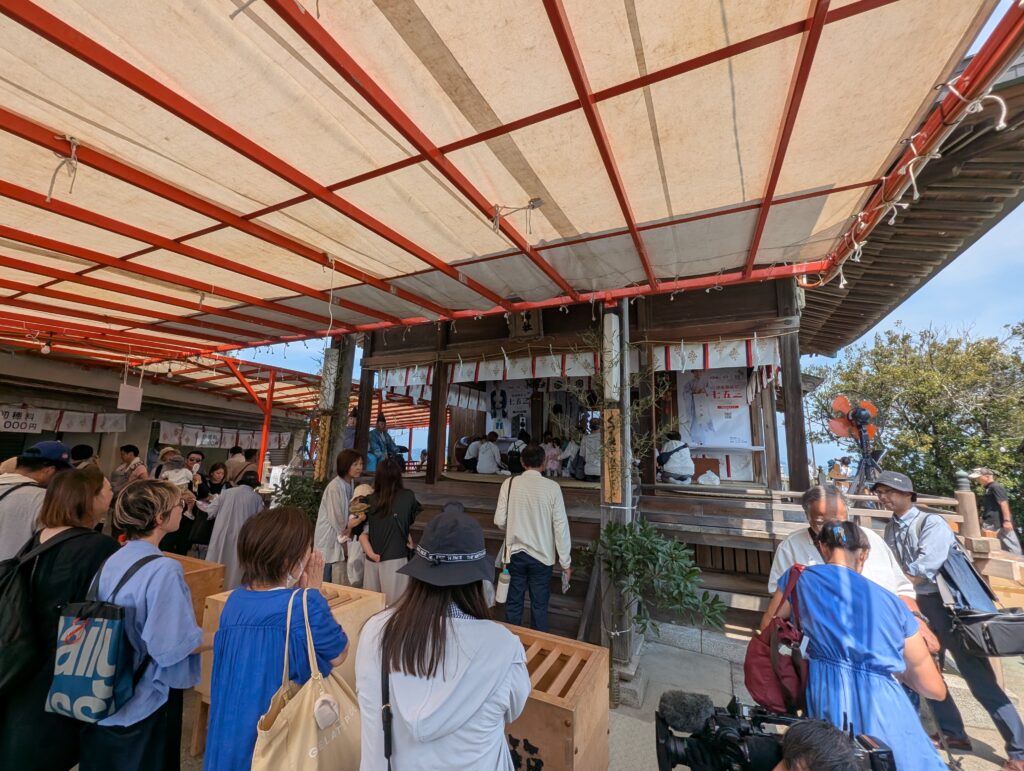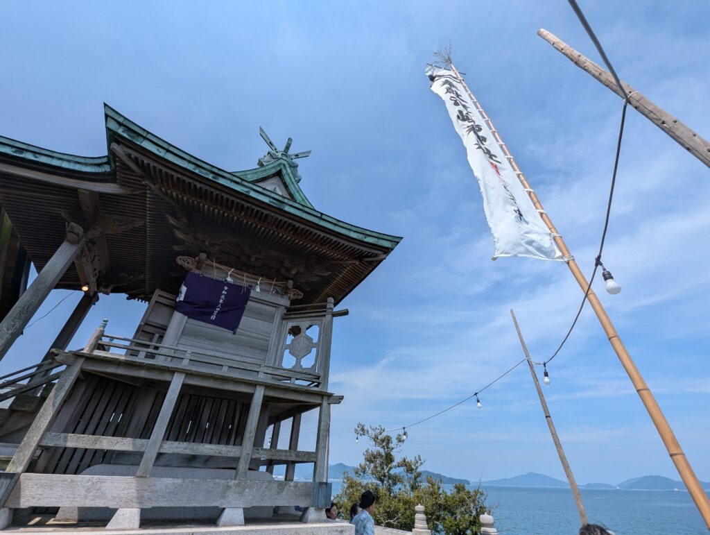 参拝を終えて裏面に回ってみる。瀬戸内海がぐるっと見渡せる。祭りののぼりがなびいていて、社殿と一緒に写真を撮りたくなった。