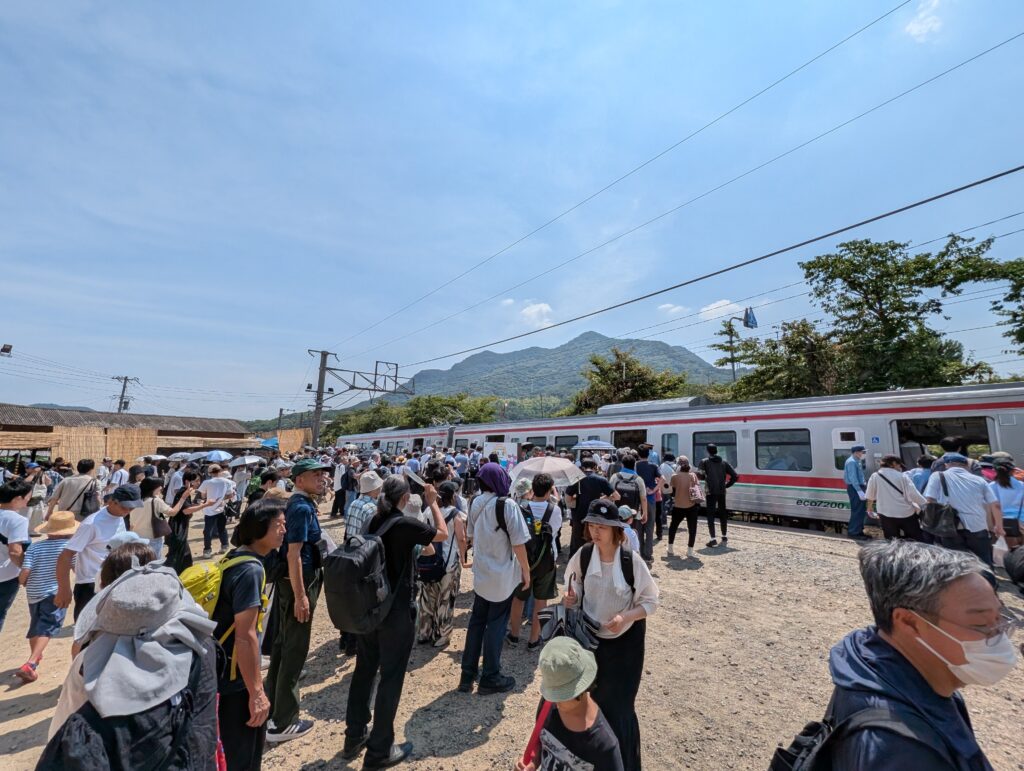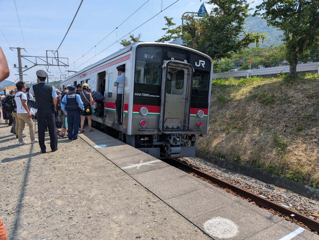 カーブした線路にホームを作っているので、車両が傾き、かなりの段差を生んでいる。乗り込むにも大股で飛ぶようにして乗る。子供たちは親と手をつなぎ乗り込む。今時こんな段差なんてないのでびっくりするが、ある意味これも面白さなのかもしれない。駅員さんの人数も都会のターミナル駅並みに配置されているのは、安全上必要なことだ。むしろ2日間のためにこれだけの人を配置して駅を営業しているJR四国は、少なからず力を入れていると感じた。